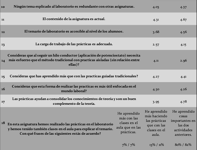 - Los alumnos consideran haber adquirido un mayor conocimiento técnico de la asignatura. Destacan que las sesiones experimentales les ayudan a consolidar los conocimientos teóricos, al estar totalmente relacionadas con los conceptos teóricos.